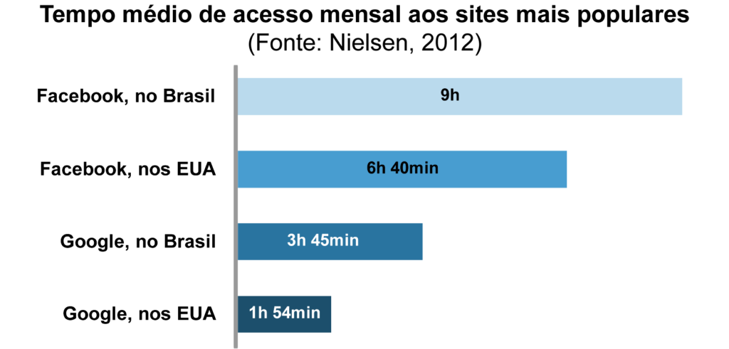 A atividade de comunicação não é somente a mais popular, mas é, principalmente, a atividade em que os usuários passam mais tempo realizando, superando em muito as horas gastas em outras atividades como, por exemplo, a busca de informações. Os brasileiros são os que passam mais tempo usando sistemas de redes sociais: cada usuário utiliza o Facebook por cerca de 9 horas mensais, muito acima do tempo que dedicamos mensalmente a outros sistemas, como o Google, o qual em média utilizamos por 3 horas e 45 minutos por mês.