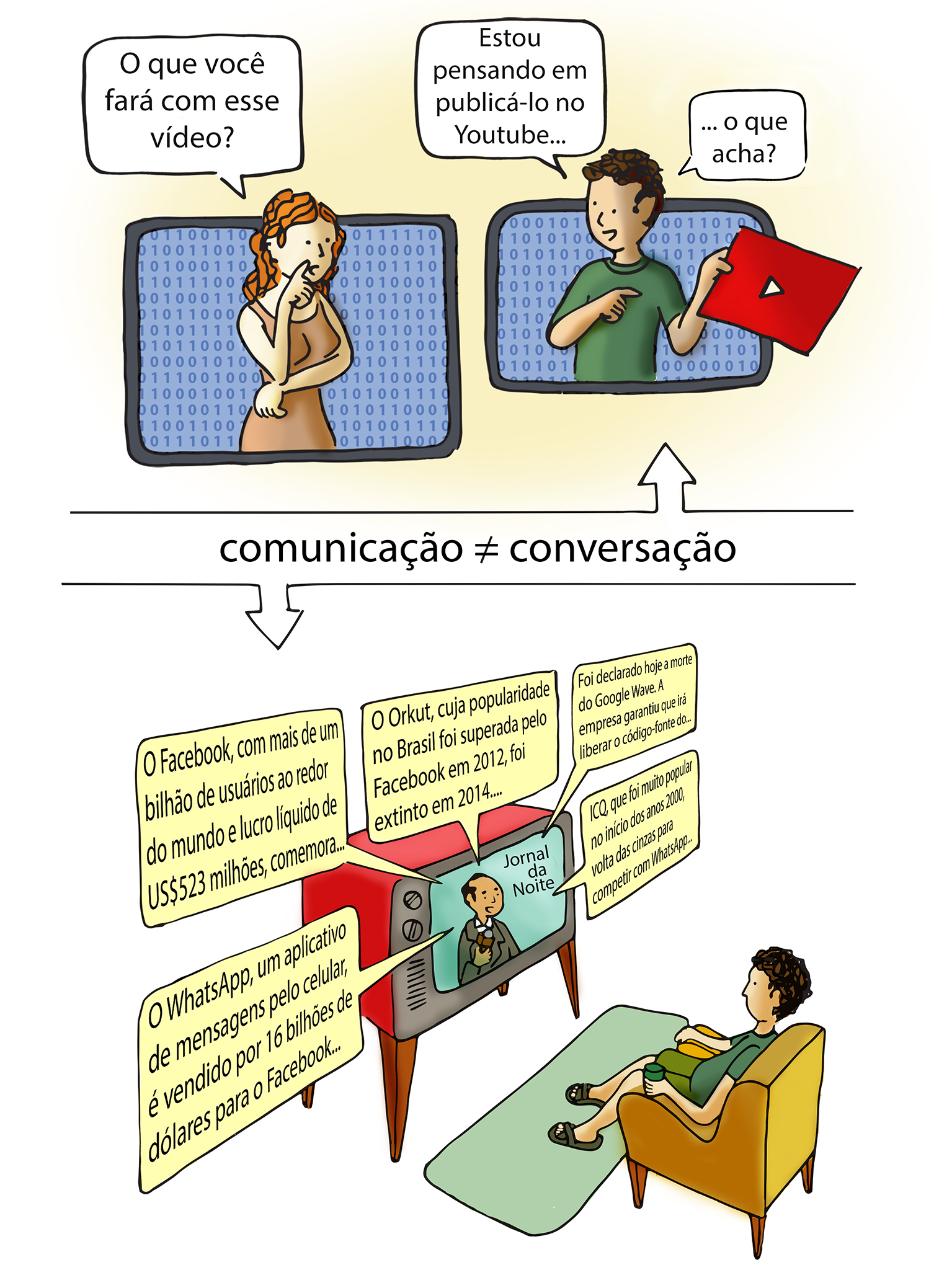 “Comunicação” é um termo muito abrangente e tradicionalmente associado aos meios de comunicação de massa, em que um emissor envia uma mensagem (um conteúdo televisionado, um programa de rádio, uma notícia impressa) para vários receptores-espectadores, estabelecendo uma comunicação unidirecional, por difusão, sem a interação entre os sujeitos envolvidos nesse processo. Já o termo conversação é tradicionalmente associado à conversação face-a-face, ao diálogo, à interação estabelecida entre interlocutores – os sujeitos são ao mesmo tempo emissores e receptores das mensagens trocadas entre eles. Embora no século passado a conversação já pudesse ser mediada por tecnologias como o telefone e a carta, foram as redes de computadores que potencializaram essa interação. Portanto, neste livro preferimos adotar o termo conversação por caracterizar melhor e restringir o nosso objeto de estudo: os meios que possibilitam a conversação entre os interlocutores. Cabe ressaltar que os estudos clássicos sobre CMC também enfocam os meios de conversação da internet, sendo investigados os fenômenos emergentes desses meios, como ausência da interação face-a-face, conversação assíncrona, anonimato, privacidade, comunidades virtuais, conversação entre multidões, dentre outros.