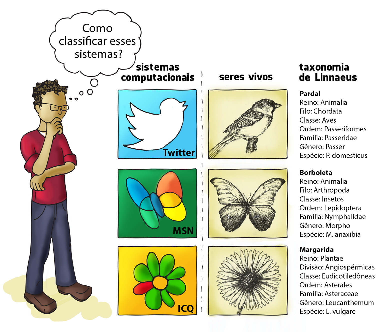 Taxonomia dos seres vivosA classificação dos seres vivos tem como base a Taxonomia de Linnaeus (1735). As unidades de classificação em uma Taxonomia são os táxons, que correspondem a grupos de organismos com características em comum. Cada táxon possui um nome e corresponde a um nível hierárquico na Taxonomia de Linnaeus, composta de sete níveis principais: Reino, Filo, Classe, Ordem, Família, Gênero e Espécie. Os seres vivos são classificados segundo critérios como aspectos morfológicos, evolutivos, funcionais e comportamentais. A representação gráfica da Taxonomia dos Seres Vivos é a Árvore da Vida ou árvore filogenética, um diagrama em forma de árvore no qual cada nó representa um antepassado comum entre os descendentes. |